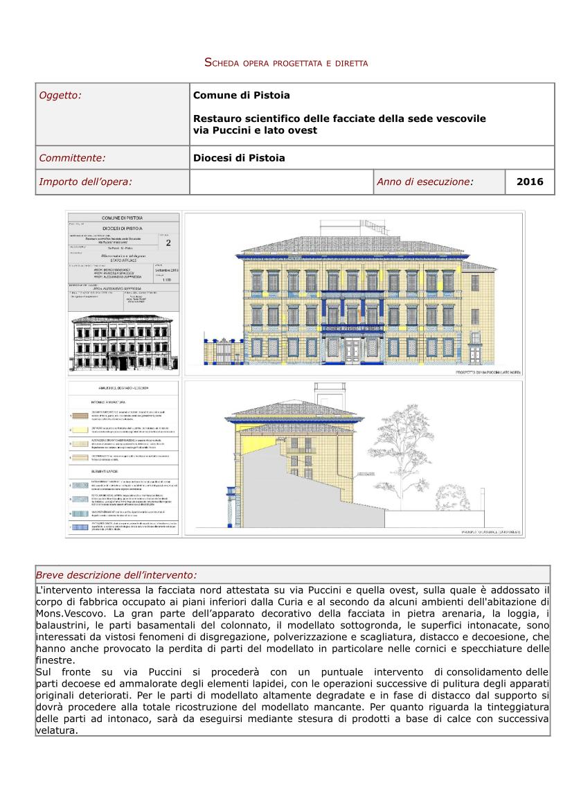 Sede vescovile Pistoia – restauro scientifico delle facciate su via Puccini e lato ovest arch.Alessandro Suppressa Direttore dei Lavori inizio lavori: 15 febbraio 2017 |